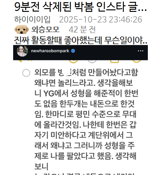 9분전 삭제된 박봄 인스타 글...