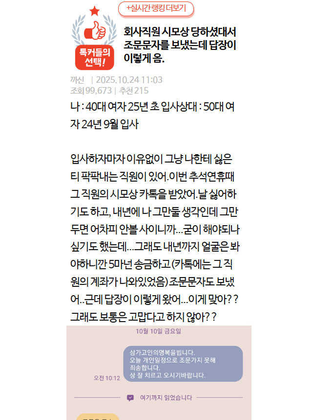 회사직원 시모상 당하셨대서 조문문자를 보냈는데 답장이 이렇게 옴