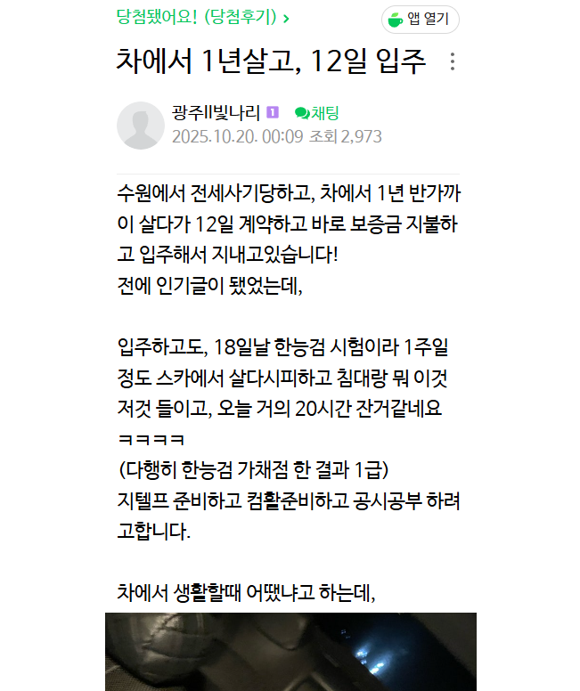 차에서 1년 살고, 12일 입주