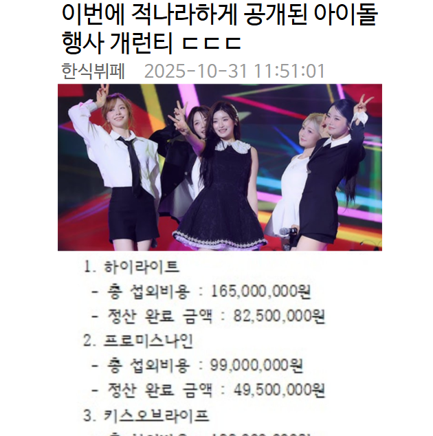 이번에 적나라하게 공개된 아이돌 행사 개런티 ㄷㄷ